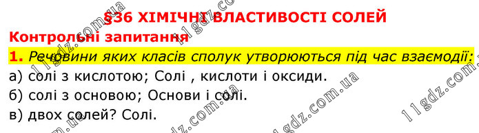 §36 ХІМІЧНІ ВЛАСТИВОСТІ СОЛЕЙ Контрольні запитання 1. Речовини яких класів сполук утворюються під час взаємодії: а) солі з кислотою; Солі , кислоти і оксиди. б) солі з основою; Основи і солі. в) двох солей? Солі.