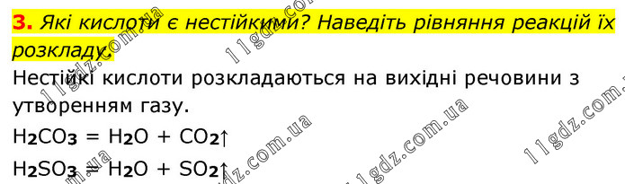 3. Які кислоти є нестійкими? Наведіть рівняння реакцій їх розкладу. Нестійкі кислоти розкладаються на вихідні речовини з утворенням газу. H2CO3 = H2O + CO2↑ H2SO3 = H2O + SO2↑