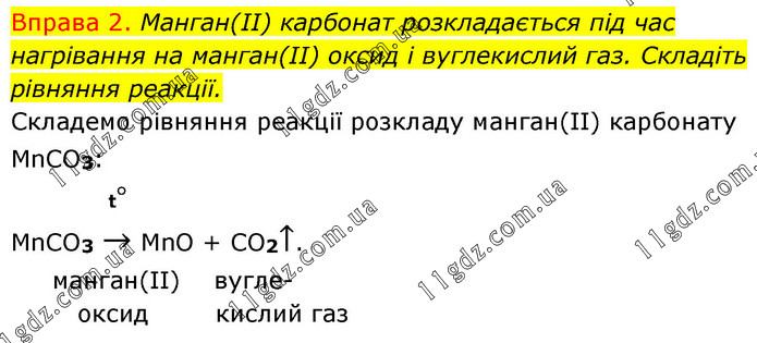 Вправа 2. Манган(II) карбонат розкладається під час нагрівання на манган(II) оксид і вуглекислий газ. Складіть рівняння реакції. Cкладемо рівняння реакції розкладу манган(ІІ) карбонату MnCO3: t° MnCO3 → MnO + CO2↑. манган(ІІ) вугле- оксид кислий газ