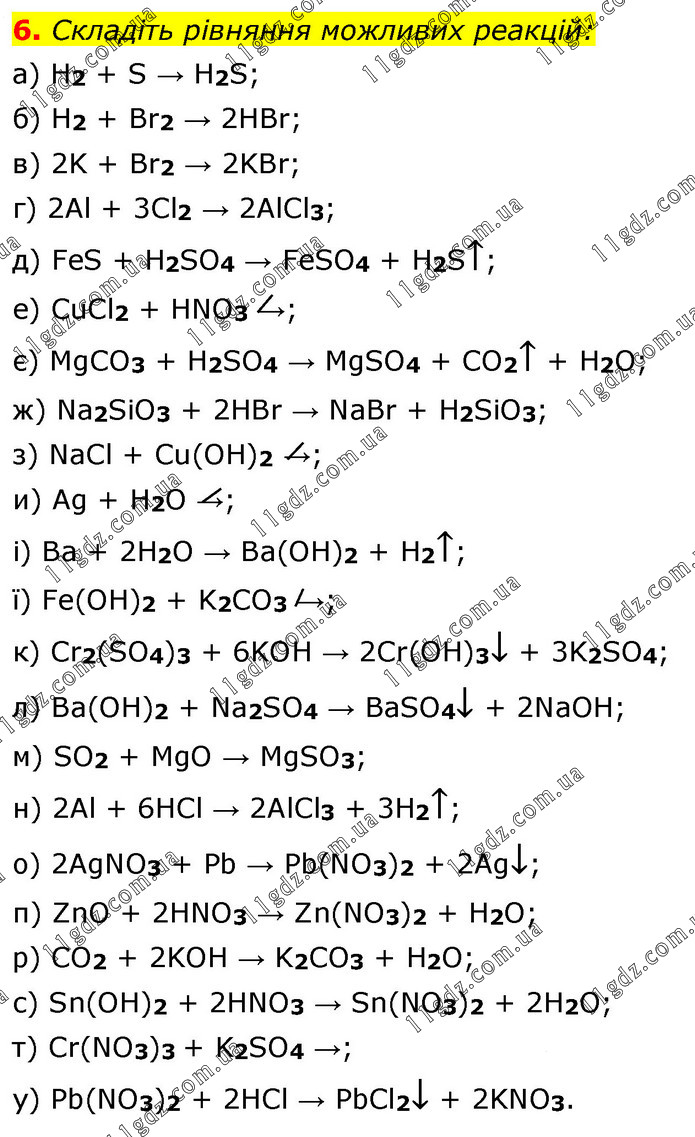 6. Складіть рівняння можливих реакцій: а) H2 + S → H2S; б) H2 + Br2 → 2HBr; в) 2K + Br2 → 2KBr; г) 2Al + 3Cl2 → 2AlCl3; д) FeS + H2SO4 → FeSO4 + H2S↑; е) CuCl2 + HNO3 →; є) MgCO3 + H2SO4 → MgSO4 + CO2↑ + H2O; ж) Na2SiO3 + 2HBr → NaBr + H2SiO3; з) NaCl + Cu(OH)2 →; и) Ag + H2O →; і) Ba + 2H2O → Ba(OH)2 + H2↑; ї) Fe(OH)2 + K2CO3 →; к) Cr2(SO4)3 + 6KOH → 2Cr(OH)3↓ + 3K2SO4; л) Ba(OH)2 + Na2SO4 → BaSO4↓ + 2NaOH; м) SO2 + MgO → MgSO3; н) 2Al + 6HCl → 2AlCl3 + 3H2↑; о) 2AgNO3 + Pb → Pb(NO3)2 + 2Ag↓; п) ZnO + 2HNO3 → Zn(NO3)2 + H2O; р) CO2 + 2KOH → K2CO3 + H2O; с) Sn(OH)2 + 2HNO3 → Sn(NO3)2 + 2H2O; т) Cr(NO3)3 + K2SO4 →; у) Pb(NO3)2 + 2HCl → PbCl2↓ + 2KNO3.