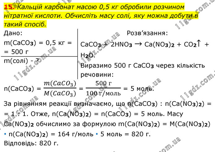 Кальцій карбонат масою 0,5 кг обробили розчином нітратної кислоти. Обчисліть масу солі, яку можна добути в такий спосіб. Дано: m(CaCO3) = 0,5 кг = = 500 г Розв’язання: CaCO3 + 2HNO3 → Ca(NO3)2 + CO2↑ + H2O. Виразимо 500 г CaCO3 через кількість речовини: m(солі) - ? n(CaCO3) = (m(CaCO_3))/(M(CaCO_3)) = (500 г)/(100 г/моль) = 5 моль. За рівнянням реакції визначаємо, що n(CaCO3) : n(Ca(NO3)2) = = 1 : 1. Отже, n(Ca(NO3)2) = n(CaCO3) = 5 моль. Масу Ca(NO3)2 обчислимо за формулою m(Ca(NO3)2) = M(Ca(NO3)2) ∙ n(Ca(NO3)2) = 164 г/моль ∙ 5 моль = 820 г. Відповідь: 820 г.