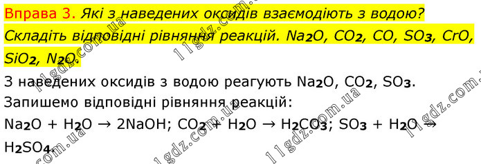 Вправа 3. Які з наведених оксидів взаємодіють з водою? Складіть відповідні рівняння реакцій. Na2O, CO2, CO, SO3, CrО, SiО2, N2O. З наведених оксидів з водою реагують Na2O, CO2, SO3. Запишемо відповідні рівняння реакцій: Na2O + H2O → 2NaOH; CO2 + H2O → H2CO3; SO3 + H2O → H2SO4.