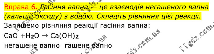 Вправа 6. Гасіння вапна — це взаємодія негашеного вапна (кальцій оксиду) з водою. Складіть рівняння цієї реакції. Запишемо рівняння реакції гасіння вапна: СаО +Н2О → Са(ОН)2 негашене вапно гашене вапно