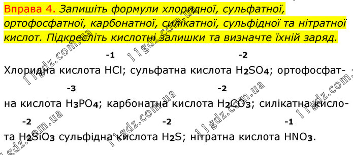 Вправа 4. Запишіть формули хлоридної, сульфатної, ортофосфатної, карбонатної, силікатної, сульфідної та нітратної кислот. Підкресліть кислотні залишки та визначте їхній заряд. -1 -2 Хлоридна кислота HCl; сульфатна кислота H2SO4; ортофосфат- -3 -2 на кислота Н3РО4; карбонатна кислота Н2СО3; силікатна кисло- -2 -2 -1 та H2SiO3 сульфідна кислота H2S; нітратна кислота HNO3.