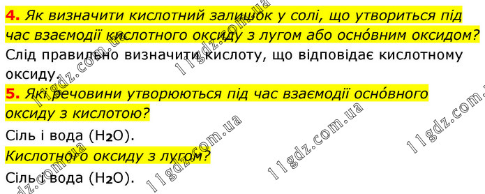 4. Як визначити кислотний залишок у солі, що утвориться під час взаємодії кислотного оксиду з лугом або оснóвним оксидом? Слід правильно визначити кислоту, що відповідає кислотному оксиду. 5. Які речовини утворюються під час взаємодії оснóвного оксиду з кислотою? Сіль і вода (Н2О). Кислотного оксиду з лугом? Сіль і вода (Н2О).