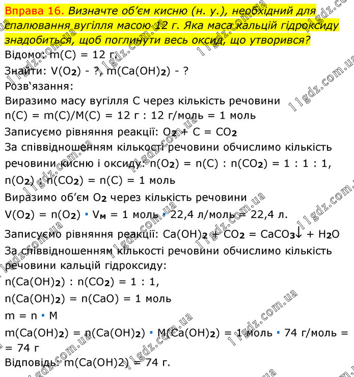 Вправа 16. Визначте об’єм кисню (н. у.), необхідний для спалювання вугілля масою 12 г. Яка маса кальцій гідроксиду знадобиться, щоб поглинути весь оксид, що утворився? Відомо: m(С) = 12 г. Знайти: V(O2) - ?, m(Ca(OH)2) - ? Розв‘язання: Виразимо масу вугілля С через кількість речовини n(С) = m(С)/M(С) = 12 г : 12 г/моль = 1 моль Записуємо рівняння реакції: О2 + С = СО2 За співвідношенням кількості речовини обчислимо кількість речовини кисню і оксиду: n(O2) = n(C) : n(CO2) = 1 : 1 : 1, n(O2) : n(CO2) = n(C) = 1 моль Виразимо об’єм O2 через кількість речовини V(O2) = n(O2) ∙ Vм = 1 моль ∙ 22,4 л/моль = 22,4 л. Записуємо рівняння реакції: Ca(OH)2 + CO2 = CaCO3↓ + H2O За співвідношенням кількості речовини обчислимо кількість речовини кальцій гідроксиду: n(Ca(OH)2) : n(CO2) = 1 : 1, n(Ca(OH)2) = n(CaO) = 1 моль m = n ∙ M m(Ca(OH)2) = n(Ca(OH)2) ∙ M(Ca(OH)2) = 1 моль ∙ 74 г/моль = = 74 г Відповідь: m(Ca(OH)2) = 74 г.