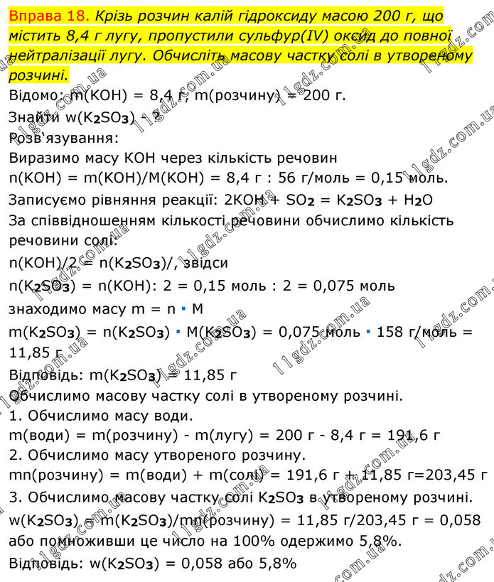 Вправа 18. Крізь розчин калій гідроксиду масою 200 г, що містить 8,4 г лугу, пропустили сульфур(IV) оксид до повної нейтралізації лугу. Обчисліть масову частку солі в утвореному розчині. Відомо: m(KOH) = 8,4 г, m(розчину) = 200 г. Знайти w(K2SO3) - ? Розв‘язування: Виразимо масу КОН через кількість речовин n(KOH) = m(KOH)/M(KOH) = 8,4 г : 56 г/моль = 0,15 моль. Записуємо рівняння реакції: 2КОН + SO2 = K2SO3 + H2O За співвідношенням кількості речовини обчислимо кількість речовини солі: n(KOH)/2 = n(K2SO3)/, звідси n(K2SO3) = n(KOH): 2 = 0,15 моль : 2 = 0,075 моль знаходимо масу m = n ∙ M m(K2SO3) = n(K2SO3) ∙ M(K2SO3) = 0,075 моль ∙ 158 г/моль = 11,85 г Відповідь: m(K2SO3) = 11,85 г Обчислимо масову частку солі в утвореному розчині. 1. Обчислимо масу води. m(води) = m(розчину) - m(лугу) = 200 г - 8,4 г = 191,6 г 2. Обчислимо масу утвореного розчину. mn(розчину) = m(води) + m(солі) = 191,6 г + 11,85 г=203,45 г 3. Обчислимо масову частку солі K2SO3 в утвореному розчині. w(K2SO3) = m(K2SO3)/mn(розчину) = 11,85 г/203,45 г = 0,058 або помноживши це число на 100% одержимо 5,8%. Відповідь: w(K2SO3) = 0,058 або 5,8%