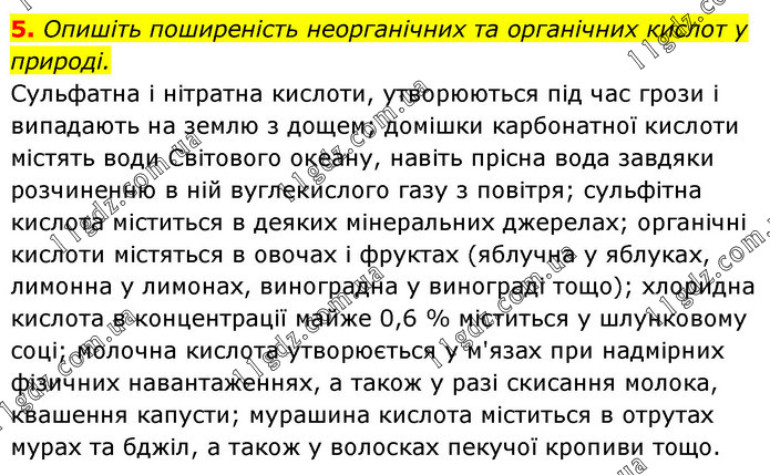 5. Опишіть поширеність неорганічних та органічних кислот у природі. Сульфатна і нітратна кислоти, утворюються під час грози і випадають на землю з дощем; домішки карбонатної кислоти містять води Світового океану, навіть прісна вода завдяки розчиненню в ній вуглекислого газу з повітря; сульфітна кислота міститься в деяких мінеральних джерелах; органічні кислоти містяться в овочах і фруктах (яблучна у яблуках, лимонна у лимонах, виноградна у винограді тощо); хлоридна кислота в концентрації майже 0,6 % міститься у шлунковому соці; молочна кислота утворюється у м'язах при надмірних фізичних навантаженнях, а також у разі скисання молока, квашення капусти; мурашина кислота міститься в отрутах мурах та бджіл, а також у волосках пекучої кропиви тощо.