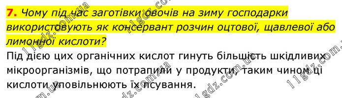 7. Чому під час заготівки овочів на зиму господарки використовують як консервант розчин оцтової, щавлевої або лимонної кислоти? Під дією цих органічних кислот гинуть більшість шкідливих мікроорганізмів, що потрапили у продукти, таким чином ці кислоти уповільнюють їх псування.