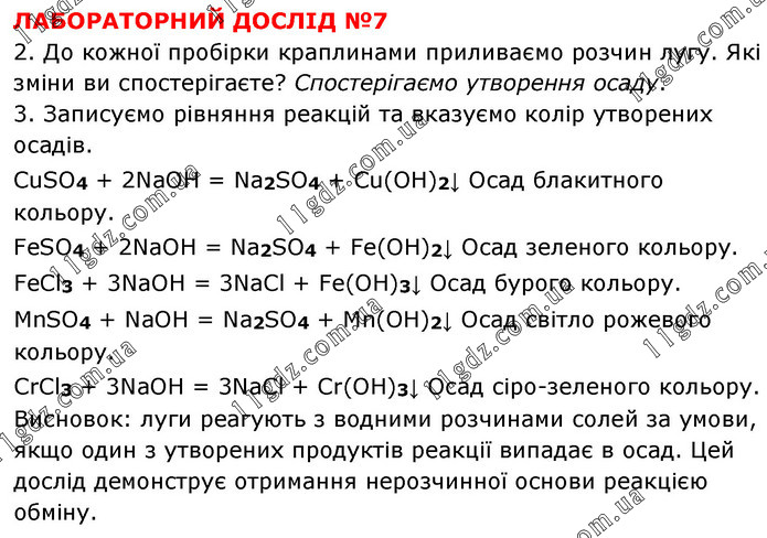 ЛАБОРАТОРНИЙ ДОСЛІД №7 2. До кожної пробірки краплинами приливаємо розчин лугу. Які зміни ви спостерігаєте? Спостерігаємо утворення осаду. 3. Записуємо рівняння реакцій та вказуємо колір утворених осадів. CuSO4 + 2NaOH = Na2SO4 + Cu(OH)2↓ Осад блакитного кольору. FeSO4 + 2NaOH = Na2SO4 + Fe(OH)2↓ Осад зеленого кольору. FeCl3 + 3NaOH = 3NaCl + Fe(OH)3↓ Осад бурого кольору. MnSO4 + NaOH = Na2SO4 + Mn(OH)2↓ Осад світло рожевого кольору. CrCl3 + 3NaOH = 3NaCl + Cr(OH)3↓ Осад сіро-зеленого кольору. Висновок: луги реагують з водними розчинами солей за умови, якщо один з утворених продуктів реакції випадає в осад. Цей дослід демонструє отримання нерозчинної основи реакцією обміну.