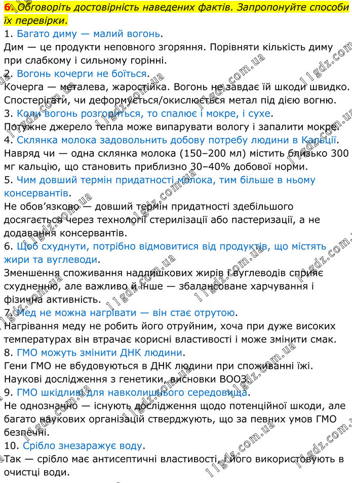 Обговоріть достовірність наведених фактів. Запропонуйте способи їх перевірки. 1. Багато диму — малий вогонь. Дим — це продукти неповного згоряння. Порівняти кількість диму при слабкому і сильному горінні. 2. Вогонь кочерги не боїться. Кочерга — металева, жаростійка. Вогонь не завдає їй шкоди швидко. Спостерігати, чи деформується/окислюється метал під дією вогню. 3. Коли вогонь розгориться, то спалює і мокре, і сухе. Потужне джерело тепла може випарувати вологу і запалити мокре. 4. Склянка молока задовольнить добову потребу людини в Кальції. Навряд чи — одна склянка молока (150–200 мл) містить близько 300 мг кальцію, що становить приблизно 30–40% добової норми. 5. Чим довший термін придатності молока, тим більше в ньому консервантів. Не обов’язково — довший термін придатності здебільшого досягається через технології стерилізації або пастеризації, а не додавання консервантів. 6. Щоб схуднути, потрібно відмовитися від продуктів, що містять жири та вуглеводи. Зменшення споживання надлишкових жирів і вуглеводів сприяє схудненню, але важливо й інше — збалансоване харчування і фізична активність. 7. Мед не можна нагрівати — він стає отрутою. Нагрівання меду не робить його отруйним, хоча при дуже високих температурах він втрачає корисні властивості і може змінити смак. 8. ГМО можуть змінити ДНК людини. Гени ГМО не вбудовуються в ДНК людини при споживанні їжі. Наукові дослідження з генетики, висновки ВООЗ. 9. ГМО шкідливі для навколишнього середовища. Не однозначно — існують дослідження щодо потенційної шкоди, але багато наукових організацій стверджують, що за певних умов ГМО безпечні. 10. Срібло знезаражує воду. Так — срібло має антисептичні властивості, і його використовують в очистці води.