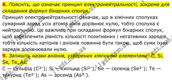 8. Поясніть, що означає принцип електронейтральності, зокрема для складання формул бінарних сполук. Принцип електронейтральності означає, що в хімічних сполуках сумарний заряд усіх атомів іонів дорівнює нулю, тобто сполука є нейтральною. Це важливо при складанні формул бінарних сполук, щоб забезпечити рівність кількості позитивних і негативних зарядів, тобто кількість катіонів і аніонів повинна бути такою, щоб суми їхніх зарядів дорівнювали нулю. 9. Запишіть назви аніонів, утворених хімічними елементами: С, Si, Se, Te, As. С — сульфід (С²⁻); Si — силіцид (Si²⁻); Se — селенід (Se²⁻); Te — телурид (Te²⁻); As — арсенід (As³⁻).