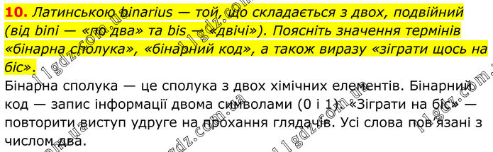 Латинською binarius — той, що складається з двох, подвійний (від bini — «по два» та bis — «двічі»). Поясніть значення термінів «бінарна сполука», «бінарний код», а також виразу «зіграти щось на біс». Бінарна сполука — це сполука з двох хімічних елементів. Бінарний код — запис інформації двома символами (0 і 1). «Зіграти на біс» — повторити виступ удруге на прохання глядачів. Усі слова пов’язані з числом два.