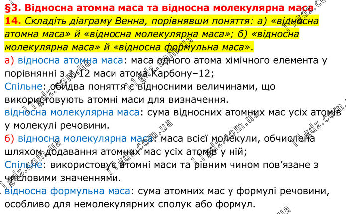 §3. Відносна атомна маса та відносна молекулярна маса 14. Складіть діаграму Венна, порівнявши поняття: а) «відносна атомна маса» й «відносна молекулярна маса»; б) «відносна молекулярна маса» й «відносна формульна маса». а) відносна атомна маса: маса одного атома хімічного елемента у порівнянні з 1/12 маси атома Карбону–12; Спільне: обидва поняття є відносними величинами, що використовують атомні маси для визначення. відносна молекулярна маса: сума відносних атомних мас усіх атомів у молекулі речовини. б) відносна молекулярна маса: маса всієї молекули, обчислена шляхом додавання атомних мас усіх атомів у ній; Спільне: використовує атомні маси та рівним чином пов’язане з числовими значеннями. відносна формульна маса: сума атомних мас у формулі речовини, особливо для немолекулярних сполук або формул.