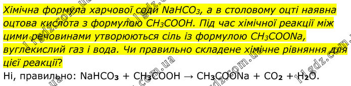 Хімічна формула харчової соди NaHCO3, а в столовому оцті наявна оцтова кислота з формулою CH3COOH. Під час хімічної реакції між цими речовинами утворюються сіль із формулою CH3COONa, вуглекислий газ і вода. Чи правильно складене хімічне рівняння для цієї реакції? Ні, правильно: NaHCO3 + CH3COOH → CH3COONa + CO2 + H2O.
