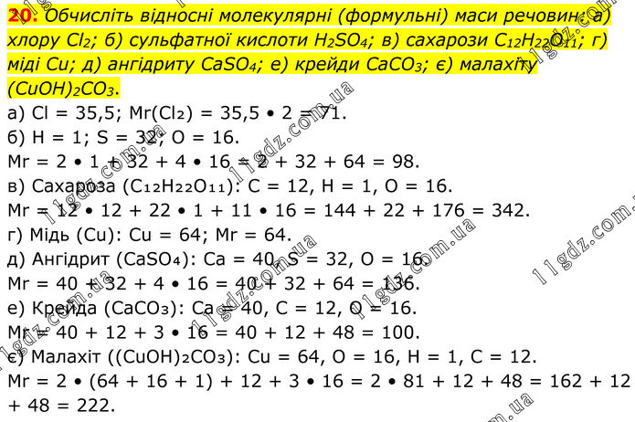 Обчисліть відносні молекулярні (формульні) маси речовин: а) хлору Cl2; б) сульфатної кислоти H2SO4; в) сахарози C12H22O11; г) міді Cu; д) ангідриту CaSO4; е) крейди CaCO3; є) малахіту (CuOH)2CO3. а) Cl = 35,5; Mr(Cl₂) = 35,5 • 2 = 71. б) H = 1; S = 32; O = 16. Mr = 2 • 1 + 32 + 4 • 16 = 2 + 32 + 64 = 98. в) Сахароза (C₁₂H₂₂O₁₁): C = 12, H = 1, O = 16. Mr = 12 • 12 + 22 • 1 + 11 • 16 = 144 + 22 + 176 = 342. г) Мідь (Cu): Cu = 64; Mr = 64. д) Ангідрит (CaSO₄): Ca = 40, S = 32, O = 16. Mr = 40 + 32 + 4 • 16 = 40 + 32 + 64 = 136. е) Крейда (CaCO₃): Ca = 40, C = 12, O = 16. Mr = 40 + 12 + 3 • 16 = 40 + 12 + 48 = 100. є) Малахіт ((CuOH)₂CO₃): Cu = 64, O = 16, H = 1, C = 12. Mr = 2 • (64 + 16 + 1) + 12 + 3 • 16 = 2 • 81 + 12 + 48 = 162 + 12 + 48 = 222.