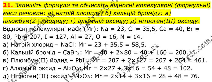 Запишіть формули та обчисліть відносні молекулярні (формульні) маси речовин: а) натрій хлориду; б) кальцій броміду; в) плюмбум(2+) йодиду; г) алюміній оксиду; д) нітроген(ІІІ) оксиду. Відносні молекулярні маси (Mr): Na = 23, Cl = 35,5, Ca = 40, Br = 80, Pb = 207, I = 127, Al = 27, O = 16, N = 14. а) Натрій хлорид – NaCl: Mr = 23 + 35,5 = 58,5. б) Кальцій бромід – CaBr₂: Mr = 40 + 2×80 = 40 + 160 = 200. в) Плюмбум(II) йодид – PbI₂: Mr = 207 + 2×127 = 207 + 254 = 461. г) Алюміній оксид – Al₂O₃: Mr = 2×27 + 3×16 = 54 + 48 = 102. д) Нітроген(III) оксид – N₂O₃: Mr = 2×14 + 3×16 = 28 + 48 = 76.