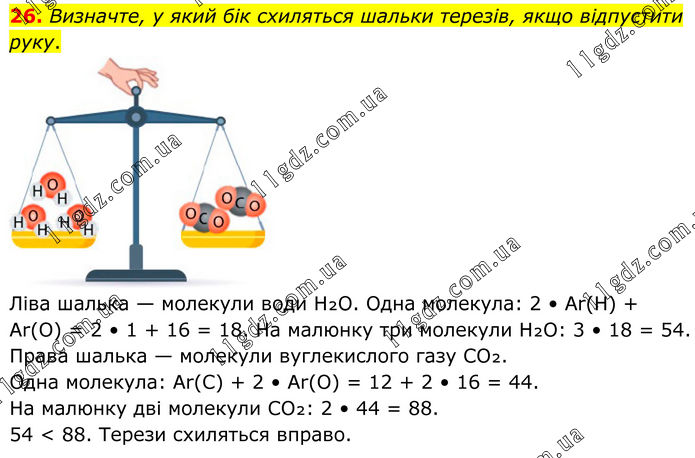 Визначте, у який бік схиляться шальки терезів, якщо відпустити руку. Ліва шалька — молекули води H₂O. Одна молекула: 2 • Ar(H) + Ar(O) = 2 • 1 + 16 = 18. На малюнку три молекули H₂O: 3 • 18 = 54. Права шалька — молекули вуглекислого газу CO₂. Одна молекула: Ar(C) + 2 • Ar(O) = 12 + 2 • 16 = 44. На малюнку дві молекули CO₂: 2 • 44 = 88. 54 < 88. Терези схиляться вправо.
