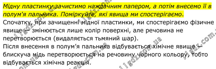 Мідну пластинку зачистимо наждачним папером, а потім внесемо її в полум'я пальника. Поміркуйте, які явища ми спостерігаємо. Спочатку, при зачищенні мідної пластинки, ми спостерігаємо фізичне явище — змінюється лише колір поверхні, але речовина не перетворюється (видаляється тьмяний шар). Після внесення в полум’я пальника відбувається хімічне явище — блискуча мідь перетворюється на речовину чорного кольору, тобто відбувається хімічна реакція.