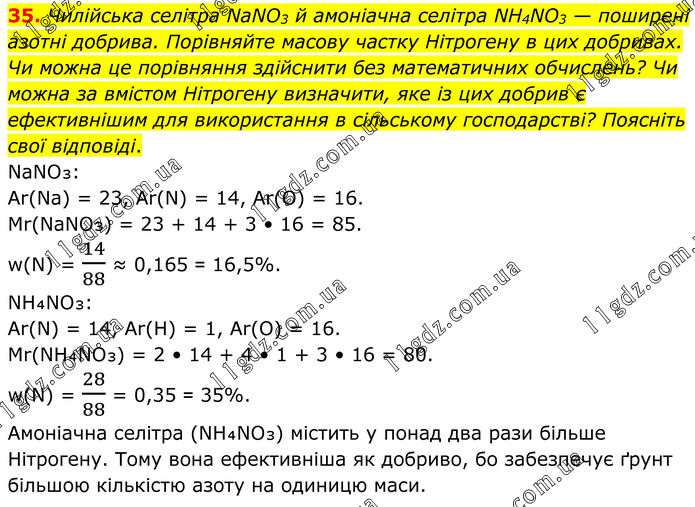 Чилійська селітра NaNO3 й амоніачна селітра NH4NO3 — поширені азотні добрива. Порівняйте масову частку Нітрогену в цих добривах. Чи можна це порівняння здійснити без математичних обчислень? Чи можна за вмістом Нітрогену визначити, яке із цих добрив є ефективнішим для використання в сільському господарстві? Поясніть свої відповіді. NaNO₃: Ar(Na) = 23, Ar(N) = 14, Ar(O) = 16. Mr(NaNO₃) = 23 + 14 + 3 • 16 = 85. w(N) = 14/88 ≈ 0,165 = 16,5%. NH₄NO₃: Ar(N) = 14, Ar(H) = 1, Ar(O) = 16. Mr(NH₄NO₃) = 2 • 14 + 4 • 1 + 3 • 16 = 80. w(N) = 28/88 = 0,35 = 35%. Амоніачна селітра (NH₄NO₃) містить у понад два рази більше Нітрогену. Тому вона ефективніша як добриво, бо забезпечує ґрунт більшою кількістю азоту на одиницю маси.