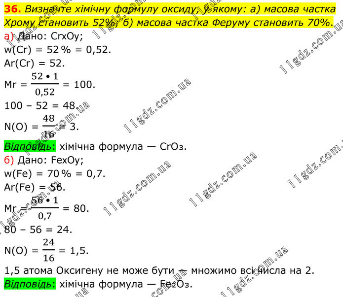 Визначте хімічну формулу оксиду, у якому: а) масова частка Хрому становить 52%; б) масова частка Феруму становить 70%. а) Дано: CrхOу; w(Cr) = 52 % = 0,52. Ar(Cr) = 52. Mr = (52 • 1)/0,52 = 100. 100 – 52 = 48. N(O) = 48/16 = 3. Відповідь: хімічна формула — CrO₃. б) Дано: FeхOу; w(Fe) = 70 % = 0,7. Ar(Fe) = 56. Mr = (56 • 1)/0,7 = 80. 80 – 56 = 24. N(O) = 24/16 = 1,5. 1,5 атома Оксигену не може бути — множимо всі числа на 2. Відповідь: хімічна формула — Fe₂O₃.