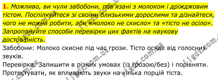 Можливо, ви чули забобони, пов’язані з молоком і дріжджовим тістом. Поспілкуйтеся зі своїми близькими дорослими та дізнайтеся, чого не можна робити, аби «молоко не скисло» та «тісто не осіло». Запропонуйте способи перевірки цих фактів на наукову достовірність. Забобони: Молоко скисне під час грози. Тісто осяде від голосних звуків. Перевірка: Залишити в різних умовах (із грозою/без) і порівняти. Протестувати, як впливають звуки на кілька порцій тіста.