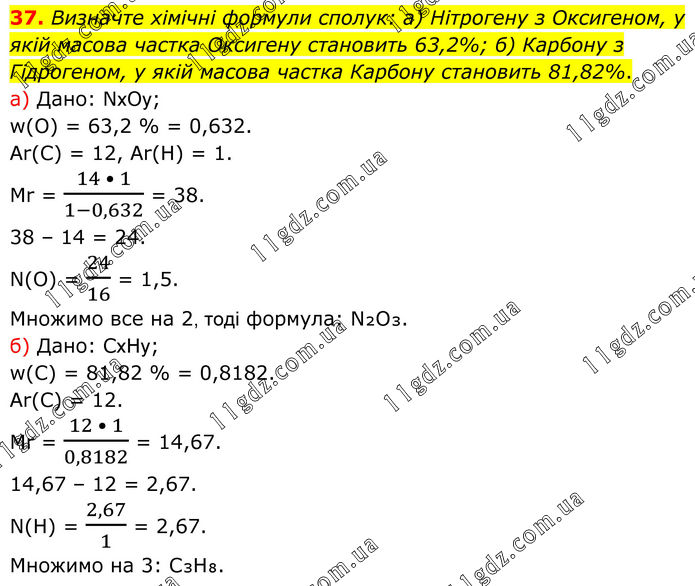 Визначте хімічні формули сполук: а) Нітрогену з Оксигеном, у якій масова частка Оксигену становить 63,2%; б) Карбону з Гідрогеном, у якій масова частка Карбону становить 81,82%. а) Дано: NхOу; w(О) = 63,2 % = 0,632. Ar(C) = 12, Ar(H) = 1. Mr = (14 • 1)/(1-0,632) = 38. 38 – 14 = 24. N(O) = 24/16 = 1,5. Множимо все на 2, тоді формула: N₂O₃. б) Дано: CхHу; w(С) = 81,82 % = 0,8182. Ar(С) = 12. Mr = (12 • 1)/0,8182 = 14,67. 14,67 – 12 = 2,67. N(Н) = 2,67/1 = 2,67. Множимо на 3: C₃H₈.