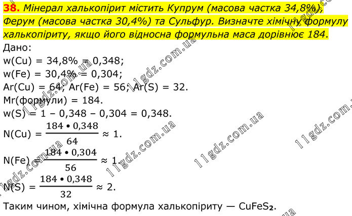 Мінерал халькопірит містить Купрум (масова частка 34,8%), Ферум (масова частка 30,4%) та Сульфур. Визначте хімічну формулу халькопіриту, якщо його відносна формульна маса дорівнює 184. Дано: w(Cu) = 34,8% = 0,348; w(Fe) = 30,4% = 0,304; Ar(Cu) = 64; Ar(Fe) = 56; Ar(S) = 32. Mr(формули) = 184. w(S) = 1 – 0,348 – 0,304 = 0,348. N(Cu) = (184 • 0,348)/64 ≈ 1. N(Fe) = (184 • 0,304)/56 ≈ 1. N(S) = (184 • 0,348)/32 ≈ 2. Таким чином, хімічна формула халькопіриту — CuFeS2.
