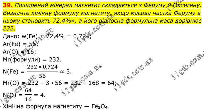 Поширений мінерал магнетит складається з Феруму й Оксигену. Визначте хімічну формулу магнетиту, якщо масова частка Феруму в ньому становить 72,4%», а його відносна формульна маса дорівнює 232. Дано: w(Fe) = 72,4% = 0,724; Ar(Fe) = 56; Ar(O) = 16; Mr(формули) = 232. N(Fe) = (232 • 0,724)/56 ≈ 3. Mr(O) = 232 – 3 • 56 = 232 – 168 = 64; N(O) = 64/16 = 4. Хімічна формула магнетиту — Fe3O4.
