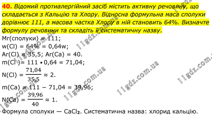 Відомий протиалергійний засіб містить активну речовину, що складається з Кальцію та Хлору. Відносна формульна маса сполуки дорівнює 111, а масова частка Хлору в ній становить 64%. Визначте формулу речовини та складіть її систематичну назву. Mr(сполуки) = 111; w(Cl) = 64% = 0,64w; Ar(Cl) = 35,5; Ar(Ca) = 40. m(Cl )= 111 • 0,64 = 71,04; N(Cl) = 71,04/35,5 ≈ 2. m(Ca) = 111 − 71,04 = 39,96; N(Ca) = 39,96/40 ≈ 1. Формула сполуки — CaCl2. Систематична назва: хлорид кальцію.