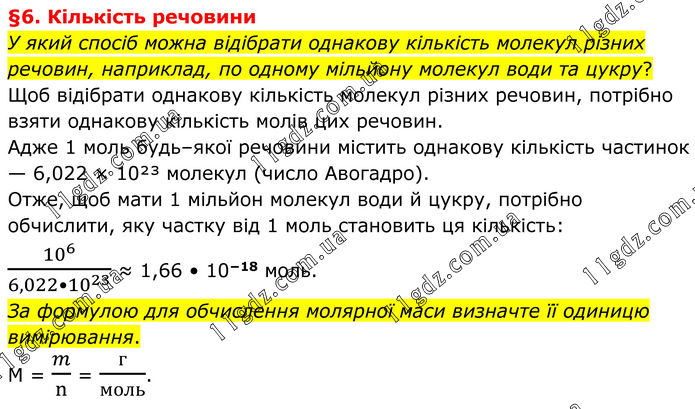 §6. Кількість речовини У який спосіб можна відібрати однакову кількість молекул різних речовин, наприклад, по одному мільйону молекул води та цукру? Щоб відібрати однакову кількість молекул різних речовин, потрібно взяти однакову кількість молів цих речовин. Адже 1 моль будь–якої речовини містить однакову кількість частинок — 6,022 × 10²³ молекул (число Авогадро). Отже, щоб мати 1 мільйон молекул води й цукру, потрібно обчислити, яку частку від 1 моль становить ця кількість: 10^6/(6,022•10^23 ) ≈ 1,66 • 10−18 моль. За формулою для обчислення молярної маси визначте її одиницю вимірювання. M = m/n = г/моль.