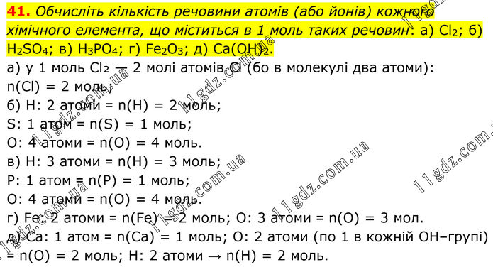 Обчисліть кількість речовини атомів (або йонів) кожного хімічного елемента, що міститься в 1 моль таких речовин: a) Cl2; б) H2SO4; в) H3PO4; г) Fe2O3; д) Ca(OH)2. а) у 1 моль Cl₂ — 2 молі атомів Cl (бо в молекулі два атоми): n(Cl) = 2 моль; б) H: 2 атоми = n(H) = 2 моль; S: 1 атом = n(S) = 1 моль; O: 4 атоми = n(O) = 4 моль. в) H: 3 атоми = n(H) = 3 моль; P: 1 атом = n(P) = 1 моль; O: 4 атоми = n(O) = 4 моль. г) Fe: 2 атоми = n(Fe) = 2 моль; O: 3 атоми = n(O) = 3 мол. д) Ca: 1 атом = n(Ca) = 1 моль; O: 2 атоми (по 1 в кожній OH–групі) = n(O) = 2 моль; H: 2 атоми → n(H) = 2 моль.