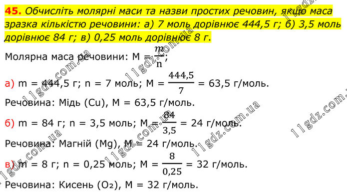 45. Обчисліть молярні маси та назви простих речовин, якщо маса зразка кількістю речовини: а) 7 моль дорівнює 444,5 г; б) 3,5 моль дорівнює 84 г; в) 0,25 моль дорівнює 8 г. Молярна маса речовини: М = m/n; а) m = 444,5 г; n = 7 моль; М = 444,5/7 = 63,5 г/моль. Речовина: Мідь (Cu), M = 63,5 г/моль. б) m = 84 г; n = 3,5 моль; М = 84/3,5 = 24 г/моль. Речовина: Магній (Mg), M = 24 г/моль. в) m = 8 г; n = 0,25 моль; М = 8/0,25 = 32 г/моль. Речовина: Кисень (O₂), M = 32 г/моль.