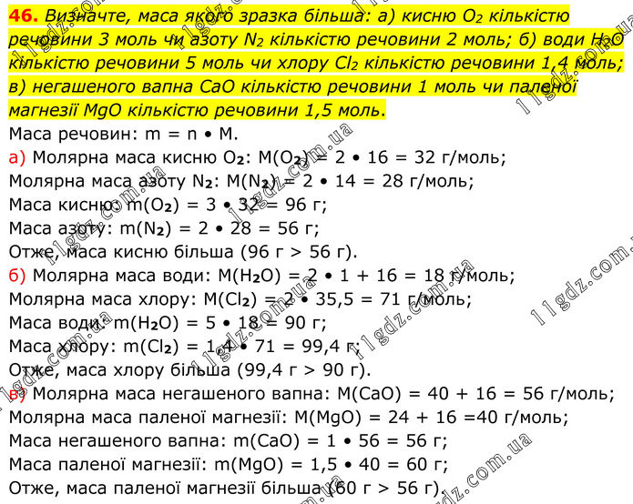 Визначте, маса якого зразка більша: а) кисню O2 кількістю речовини 3 моль чи азоту N2 кількістю речовини 2 моль; б) води H2O кількістю речовини 5 моль чи хлору Cl2 кількістю речовини 1,4 моль; в) негашеного вапна CaO кількістю речовини 1 моль чи паленої магнезії MgO кількістю речовини 1,5 моль. Маса речовин: m = n • M. а) Молярна маса кисню O2: M(O2) = 2 • 16 = 32 г/моль; Молярна маса азоту N2: M(N2) = 2 • 14 = 28 г/моль; Маса кисню: m(O2) = 3 • 32 = 96 г; Маса азоту: m(N2) = 2 • 28 = 56 г; Отже, маса кисню більша (96 г > 56 г). б) Молярна маса води: M(H2O) = 2 • 1 + 16 = 18 г/моль; Молярна маса хлору: M(Cl2) = 2 • 35,5 = 71 г/моль; Маса води: m(H2O) = 5 • 18 = 90 г; Маса хлору: m(Cl2) = 1,4 • 71 = 99,4 г; Отже, маса хлору більша (99,4 г > 90 г). в) Молярна маса негашеного вапна: M(CaO) = 40 + 16 = 56 г/моль; Молярна маса паленої магнезії: M(MgO) = 24 + 16 =40 г/моль; Маса негашеного вапна: m(CaO) = 1 • 56 = 56 г; Маса паленої магнезії: m(MgO) = 1,5 • 40 = 60 г; Отже, маса паленої магнезії більша (60 г > 56 г).