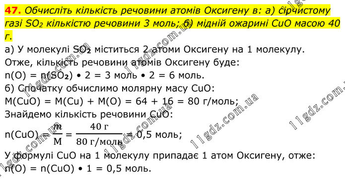 Обчисліть кількість речовини атомів Оксигену в: а) сірчистому газі SO2 кількістю речовини 3 моль; б) мідній ожарині CuO масою 40 г. а) У молекулі SO2 міститься 2 атоми Оксигену на 1 молекулу. Отже, кількість речовини атомів Оксигену буде: n(O) = n(SO2) • 2 = 3 моль • 2 = 6 моль. б) Спочатку обчислимо молярну масу CuO: M(CuO) = M(Cu) + M(O) = 64 + 16 = 80 г/моль; Знайдемо кількість речовини CuO: n(CuO) = m/M = (40 г)/(80 г/моль) = 0,5 моль; У формулі CuO на 1 молекулу припадає 1 атом Оксигену, отже: n(O) = n(CuO) • 1 = 0,5 моль.