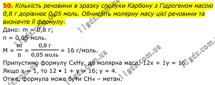 Кількість речовини в зразку сполуки Карбону з Гідрогеном масою 0,8 г дорівнює 0,05 моль. Обчисліть молярну масу цієї речовини та визначте її формулу. Дано: m = 0,8 г; n = 0,05 моль. М = m/n = (0,8 г)/(0,05 моль) = 16 г/моль. Припустимо формулу CxHy, де молярна маса: 12x + 1y = 16. Якщо x = 1, то 12 • 1 + y = 16; y = 4. Отже, формула може бути CH₄ – метан.