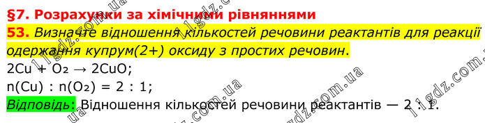 §7. Розрахунки за хімічними рівняннями 53. Визначте відношення кількостей речовини реактантів для реакції одержання купрум(2+) оксиду з простих речовин. 2Cu + O₂ → 2CuO; n(Cu) : n(O₂) = 2 : 1; Відповідь: Відношення кількостей речовини реактантів — 2 : 1.