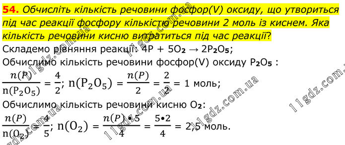 54. Обчисліть кількість речовини фосфор(V) оксиду, що утвориться під час реакції фосфору кількістю речовини 2 моль із киснем. Яка кількість речовини кисню витратиться під час реакції? Складемо рівняння реакції: 4P + 5O2 → 2P2O5; Обчислимо кількість речовини фосфор(V) оксиду P2O5 : (n(P))/(n(Р_2 О_5)) = 4/2; n(Р_2 О_5) = (n(P))/2 = 2/2 = 1 моль; Обчислимо кількість речовини кисню O2: (n(P))/(n(О_2)) = 4/5; n(О_2) = (n(P) • 5)/4 = (5•2)/4 = 2,5 моль.