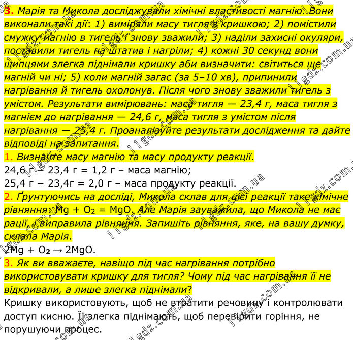 Марія та Микола досліджували хімічні властивості магнію. Вони виконали такі дії: 1) виміряли масу тигля з кришкою; 2) помістили смужку магнію в тигель і знову зважили; 3) наділи захисні окуляри, поставили тигель на штатив і нагріли; 4) кожні 30 секунд вони щипцями злегка піднімали кришку аби визначити: світиться ще магній чи ні; 5) коли магній загас (за 5–10 хв), припинили нагрівання й тигель охолонув. Після чого знову зважили тигель з умістом. Результати вимірювань: маса тигля — 23,4 г, маса тигля з магнієм до нагрівання — 24,6 г, маса тигля з умістом після нагрівання — 25,4 г. Проаналізуйте результати дослідження та дайте відповіді на запитання. 1. Визначте масу магнію та масу продукту реакції. 24,6 г − 23,4 г = 1,2 г – маса магнію; 25,4 г − 23,4г = 2,0 г – маса продукту реакції. 2. Ґрунтуючись на досліді, Микола склав для цієї реакції таке хімічне рівняння: Mg + O2 = MgO. Але Марія зауважила, що Микола не має рації, і виправила рівняння. Запишіть рівняння, яке, на вашу думку, склала Марія. 2Mg + O2 → 2MgO. 3. Як ви вважаєте, навіщо під час нагрівання потрібно використовувати кришку для тигля? Чому під час нагрівання її не відкривали, а лише злегка піднімали? Кришку використовують, щоб не втратити речовину і контролювати доступ кисню. Її злегка піднімають, щоб перевірити горіння, не порушуючи процес.