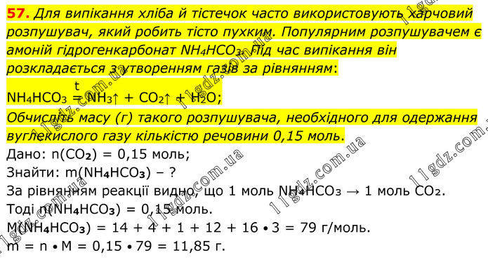 Для випікання хліба й тістечок часто використовують харчовий розпушувач, який робить тісто пухким. Популярним розпушувачем є амоній гідрогенкарбонат NH4HCO3. Під час випікання він розкладається з утворенням газів за рівнянням: NH4HCO3 =(t) NH3↑ + CО2↑ + H2O; Обчисліть масу (г) такого розпушувача, необхідного для одержання вуглекислого газу кількістю речовини 0,15 моль. Дано: n(CO2) = 0,15 моль; Знайти: m(NH4HCO3) – ? За рівнянням реакції видно, що 1 моль NH₄HCO₃ → 1 моль CO₂. Тоді n(NH4HCO3) = 0,15 моль. M(NH4HCO3) = 14 + 4 + 1 + 12 + 16 • 3 = 79 г/моль. m = n • M = 0,15 • 79 = 11,85 г.