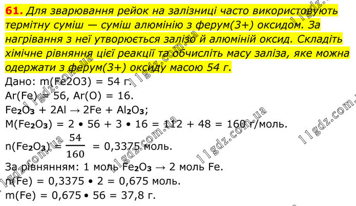 Для зварювання рейок на залізниці часто використовують термітну суміш — суміш алюмінію з ферум(3+) оксидом. За нагрівання з неї утворюється залізо й алюміній оксид. Складіть хімічне рівняння цієї реакції та обчисліть масу заліза, яке можна одержати з ферум(3+) оксиду масою 54 г. Дано: m(Fe2O3) = 54 г. Ar(Fe) = 56, Ar(O) = 16. Fe2O3 + 2Al → 2Fe + Al2O3; M(Fe2O3) = 2 • 56 + 3 • 16 = 112 + 48 = 160 г/моль. n(Fe2O3) = 54/160 = 0,3375 моль. За рівнянням: 1 моль Fe2O3 → 2 моль Fe. n(Fe) = 0,3375 • 2 = 0,675 моль. m(Fe) = 0,675 • 56 = 37,8 г.