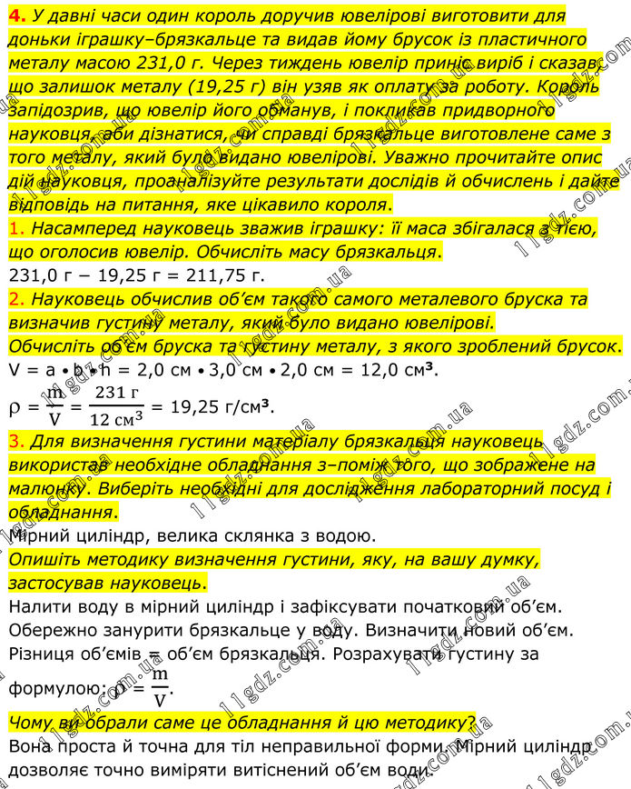 У давні часи один король доручив ювелірові виготовити для доньки іграшку–брязкальце та видав йому брусок із пластичного металу масою 231,0 г. Через тиждень ювелір приніс виріб і сказав, що залишок металу (19,25 г) він узяв як оплату за роботу. Король запідозрив, що ювелір його обманув, і покликав придворного науковця, аби дізнатися, чи справді брязкальце виготовлене саме з того металу, який було видано ювелірові. Уважно прочитайте опис дій науковця, проаналізуйте результати дослідів й обчислень і дайте відповідь на питання, яке цікавило короля. 1. Насамперед науковець зважив іграшку: її маса збігалася з тією, що оголосив ювелір. Обчисліть масу брязкальця. 231,0 г − 19,25 г = 211,75 г. 2. Науковець обчислив об’єм такого самого металевого бруска та визначив густину металу, який було видано ювелірові. Обчисліть об’єм бруска та густину металу, з якого зроблений брусок. V = a • b • h = 2,0 см • 3,0 см • 2,0 см = 12,0 см3. ρ = m/V = (231 г)/(12 〖см〗^3 ) = 19,25 г/см3. 3. Для визначення густини матеріалу брязкальця науковець використав необхідне обладнання з–поміж того, що зображене на малюнку. Виберіть необхідні для дослідження лабораторний посуд і обладнання. Мірний циліндр, велика склянка з водою. Опишіть методику визначення густини, яку, на вашу думку, застосував науковець. Налити воду в мірний циліндр і зафіксувати початковий об’єм. Обережно занурити брязкальце у воду. Визначити новий об’єм. Різниця об’ємів = об’єм брязкальця. Розрахувати густину за формулою: ρ = m/V. Чому ви обрали саме це обладнання й цю методику? Вона проста й точна для тіл неправильної форми. Мірний циліндр дозволяє точно виміряти витіснений об’єм води.
