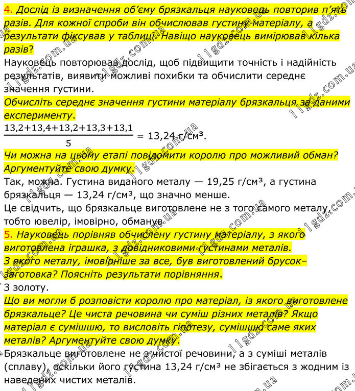 4. Дослід із визначення об’єму брязкальця науковець повторив п’ять разів. Для кожної спроби він обчислював густину матеріалу, а результати фіксував у таблиці. Навіщо науковець вимірював кілька разів? Науковець повторював дослід, щоб підвищити точність і надійність результатів, виявити можливі похибки та обчислити середнє значення густини. Обчисліть середнє значення густини матеріалу брязкальця за даними експерименту. (13,2+13,4+13,2+13,3+13,1)/5 = 13,24 г/см3. Чи можна на цьому етапі повідомити королю про можливий обман? Аргументуйте свою думку. Так, можна. Густина виданого металу — 19,25 г/см³, а густина брязкальця — 13,24 г/см³, що значно менше. Це свідчить, що брязкальце виготовлене не з того самого металу, тобто ювелір, імовірно, обманув 5. Науковець порівняв обчислену густину матеріалу, з якого виготовлена іграшка, з довідниковими густинами металів. З якого металу, імовірніше за все, був виготовлений брусок–заготовка? Поясніть результати порівняння. З золоту. Що ви могли б розповісти королю про матеріал, із якого виготовлене брязкальце? Це чиста речовина чи суміш різних металів? Якщо матеріал є сумішшю, то висловіть гіпотезу, сумішшю саме яких металів? Аргументуйте свою думку. Брязкальце виготовлене не з чистої речовини, а з суміші металів (сплаву), оскільки його густина 13,24 г/см³ не збігається з жодним із наведених чистих металів.