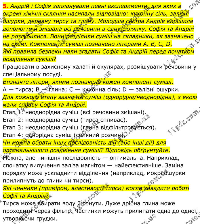 Андрій і Софія запланували певні експерименти, для яких в окремі хімічні склянки насипали відповідно: кухонну сіль, залізні ошурки, деревну тирсу та глину. Молодша сестра Андрія вирішила допомогти й змішала всі речовини в одну склянку. Софія та Андрій не розгубилися. Вони розділили суміш на складники, як зазначено на схемі. Компоненти суміші позначено літерами А, В, С, D. Які правила безпеки мали згадати Софія та Андрій перед початком розділення суміші? Працювати в захисному халаті й окулярах, розмішувати речовини у спеціальному посуді. Визначте літери, якими позначено кожен компонент суміші. A — тирса; B — глина; C — кухонна сіль; D — залізні ошурки. Для кожного етапу зазначте суміш (однорідна/неоднорідна), з якою мали справу Софія та Андрій. Етап 1: неоднорідна суміш (всі речовини змішані). Етап 2: неоднорідна суміш (тирса спливає). Етап 3: неоднорідна суміш (глина відфільтровується). Етап 4: однорідна суміш (соляний розчин). Чи можна обрати іншу послідовність дій (або інші дії) для оптимальнішого розділення суміші? Відповідь обґрунтуйте. Можна, але нинішня послідовність — оптимальна. Наприклад, спочатку вилучення заліза магнітом — найефективніше. Заміна порядку може ускладнити відділення (наприклад, мокрі ошурки прилипнуть до глини чи тирси). Які чинники (приміром, властивості тирси) могли завадити роботі Софії та Андрія? Тирса може вбирати воду й тонути. Дуже дрібна глина може проходити через фільтр. Частинки можуть прилипати одна до одної, утворюючи грудки.