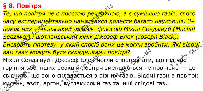 § 8. Повітря Te, що повітря не є простою речовиною, а є сумішшю газів, свого часу експериментально намагалися довести багато науковців. З–поміж них — польський алхімік–філософ Міхал Сендзівуй (Machal Sedziwoj) і шотландський хімік Джозеф Блек (Joseph Black). Висловіть гіпотезу, у який спосіб вони це могли зробити. Які відомі вам гази можуть бути складниками повітрі? Міхал Сендзівуй і Джозеф Блек могли спостерігати, що під час горіння або інших реакцій повітря зменшується не повністю — це свідчить, що воно складається з різних газів. Відомі гази в повітрі: кисень, азот, аргон, вуглекислий газ та інші слідові гази.