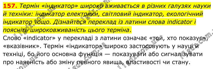 157. Термін «індикатор» широко вживається в різних галузях науки й техніки: індикатор електрики, світловий індикатор, екологічний індикатор тощо. Дізнайтеся переклад із латини слова indicator і поясніть широковживаність цього терміна. Слово «indicator» у перекладі з латини означає «той, хто показує», «вказівник». Термін «індикатор» широко застосовують у науці й техніці, бо його основна функція — показувати або сигналізувати про наявність або зміну певного явища, властивості чи стану.