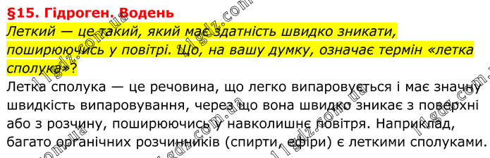 §15. Гідроген. Водень Леткий — це такий, який має здатність швидко зникати, поширюючись у повітрі. Що, на вашу думку, означає термін «летка сполука»? Летка сполука — це речовина, що легко випаровується і має значну швидкість випаровування, через що вона швидко зникає з поверхні або з розчину, поширюючись у навколишнє повітря. Наприклад, багато органічних розчинників (спирти, ефіри) є леткими сполуками.