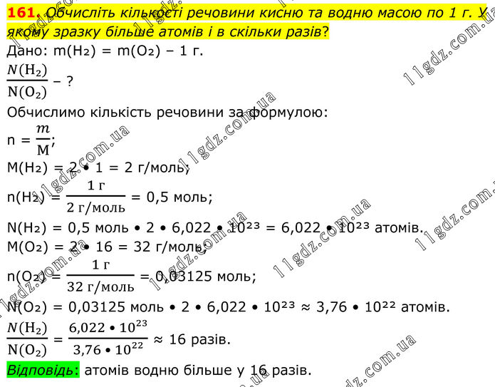 161. Обчисліть кількості речовини кисню та водню масою по 1 г. У якому зразку більше атомів і в скільки разів? Дано: m(H₂) = m(O₂) – 1 г. (N(H₂))/(N(O₂)) – ? Обчислимо кількість речовини за формулою: n = m/M; М(H₂) = 2 • 1 = 2 г/моль; n(H₂) = (1 г)/(2 г/моль) = 0,5 моль; N(H₂) = 0,5 моль • 2 • 6,022 • 10²³ = 6,022 • 10²³ атомів. М(O₂) = 2 • 16 = 32 г/моль; n(O₂) = (1 г)/(32 г/моль) = 0,03125 моль; N(O₂) = 0,03125 моль • 2 • 6,022 • 10²³ ≈ 3,76 • 10²² атомів. (N(H₂))/(N(O₂)) = (6,022 • 10²³)/(3,76 • 10²²) ≈ 16 разів. Відповідь: атомів водню більше у 16 разів.