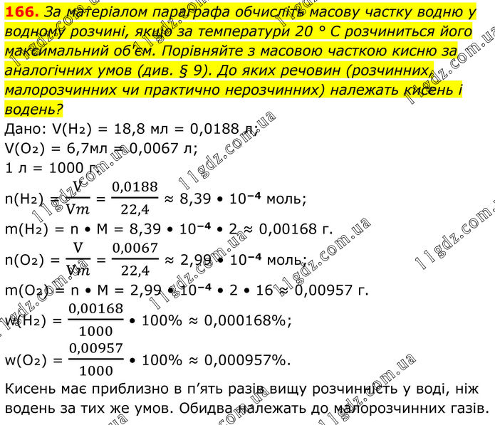 166. За матеріалом параграфа обчисліть масову частку водню у водному розчині, якщо за температури 20 ° С розчиниться його максимальний об'єм. Порівняйте з масовою часткою кисню за аналогічних умов (див. § 9). До яких речовин (розчинних, малорозчинних чи практично нерозчинних) належать кисень і водень? Дано: V(H₂) = 18,8 мл = 0,0188 л; V(O₂) = 6,7мл = 0,0067 л; 1 л = 1000 г. n(H₂) = V/Vm = 0,0188/22,4 ≈ 8,39 • 10−4 моль; m(H₂) = n • M = 8,39 • 10−4 • 2 ≈ 0,00168 г. n(O₂) = V/Vm = 0,0067/22,4 ≈ 2,99 • 10−4 моль; m(O₂) = n • M = 2,99 • 10−4 • 2 • 16 ≈ 0,00957 г. w(H₂) = 0,00168/1000 • 100% ≈ 0,000168%; w(O₂) = 0,00957/1000 • 100% ≈ 0,000957%. Кисень має приблизно в п’ять разів вищу розчинність у воді, ніж водень за тих же умов. Обидва належать до малорозчинних газів.