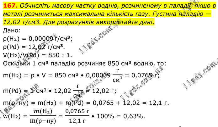 167. Обчисліть масову частку водню, розчиненому в паладії, якщо в металі розчиниться максимальна кількість газу. Густина паладію — 12,02 г/см3. Для розрахунків використайте дані. Дано: ρ(H₂) = 0,00009 г/см3; ρ(Pd) = 12,02 г/см3. V(H₂)/V(Pd) = 850 : 1. Оскільки 1 см³ паладію розчиняє 850 см³ водню, то: m(H₂) = ρ • V = 850 см³ • 0,00009 г/см³ = 0,0765 г; m(Pd) = 1 см³ • 12,02 г/см³ = 12,02 г; m(р–ну) = m(H₂) + m(Pd) = 0,0765 + 12,02 = 12,1 г. w(H₂) = (m(H₂))/(m(р-ну)) = (0,0765 г)/(12,1 г) • 100% = 0,63%.